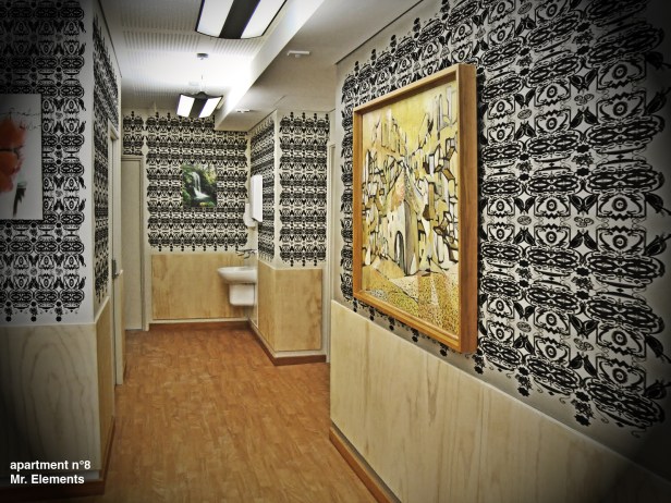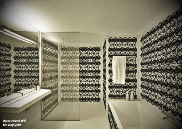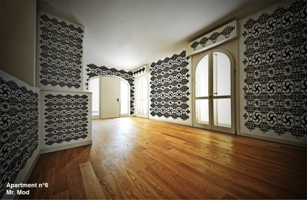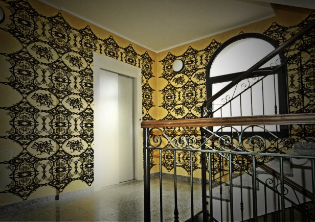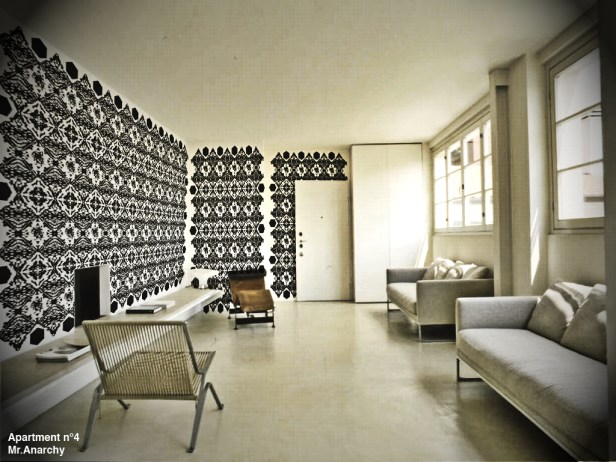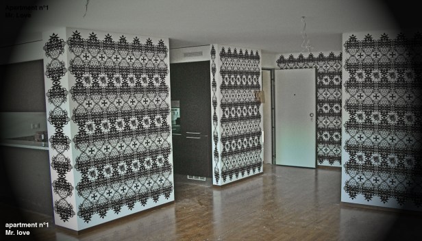 Più il tempo va avanti e più le persone tendono ad assicurarsi una completa vita solitaria, per ridurre al minimo le profetizzate disgrazie che incombono nelle strade o nei luoghi all’aria aperta. Però ci si incoraggia sempre di più a trasformare la propria tana (casa), per renderla ipercomoda, e allo stesso tempo spazio all’aria aperta. Con questo non voglio dar spazio alla creatività carceraria-domestica, ma dato che i tempi stanno per cambiare, cerco disperatamente di dare un messaggio forte e chiaro, le mie carte da parati parlano e ti fissano in continuazione simboleggiando tutto ciò che parzialmente non viene simboleggiato all’esterno. Ti potranno far riflettere, ti potranno far prendere qualche voglia, ma sicuro non ti annoieranno mai. Un’ esperienza illustrativa e calligrafica all’interno di una propria tana è l’essenziale per una pura sana originale follia cranica… (a tempo indeterminato)