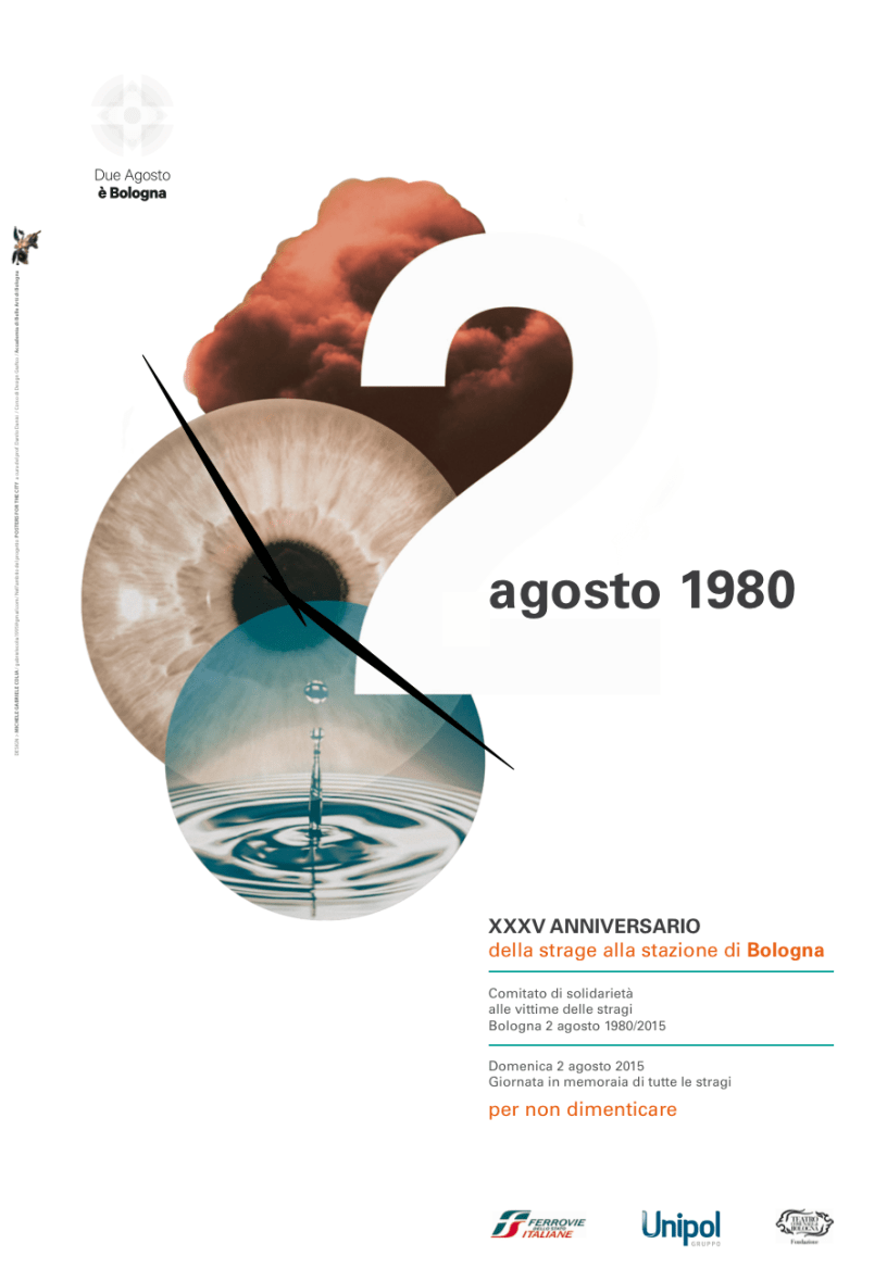 Poster commemorativo per la commemorazione della Strage del 2 Agosto 1980 alla Stazione ferroviaria di Bologna.