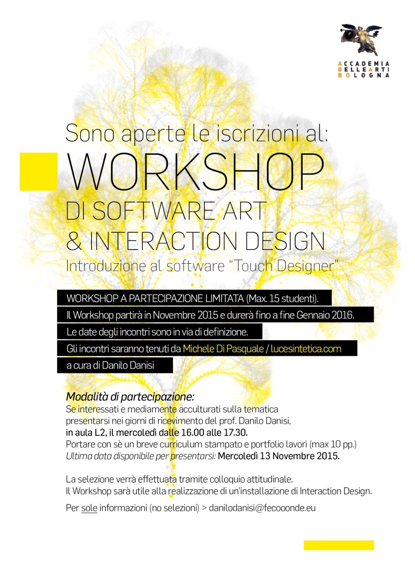 La selezione degli studenti partecipanti verrà effettuata tramite colloquio attitudinale. Il Workshop sarà utile alla realizzazione di un’installazione di Interaction Design, che sarà esposta in occasione di ArtWhiteNight 2016 @ababo