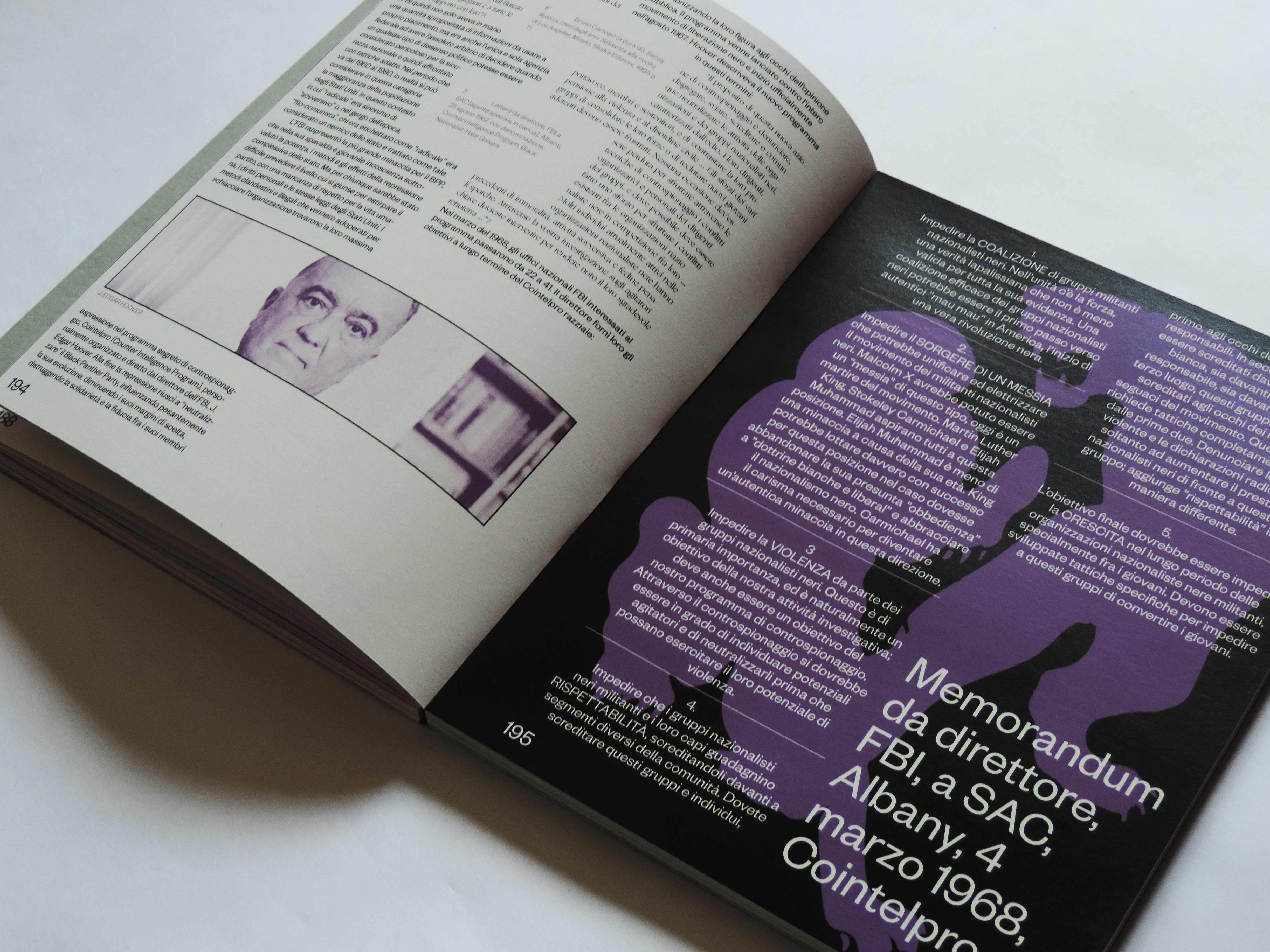 The whole book is masterfully designed in an incredible contemporary mix of “brutalist ” and “bored-chic” graphic styles, using limited color palette for each chapter, bitmap and glitched aesthetics, old school referencies, card inserts, with an excellent alternation between pages of text/documents and re-interpreted historical images. 90% of the book is strictly printed on recycled paper.