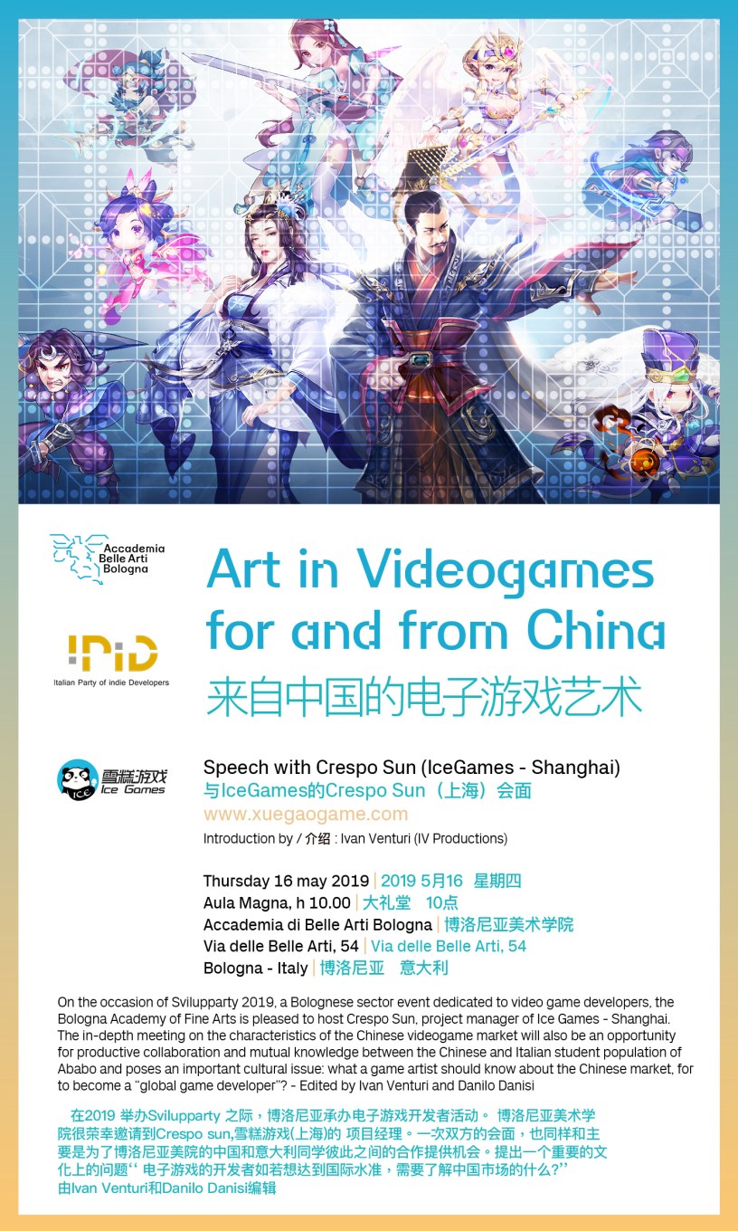 On the occasion of Svilupparty 2019, a Bolognese sector event dedicated to video game developers, the Bologna Academy of Fine Arts is pleased to host Crespo Sun, project manager of Ice Games – Shanghai. The in-depth meeting on the characteristics of the Chinese videogame market will also be an opportunity for productive collaboration and mutual knowledge between the Chinese and Italian student population of Ababo and poses an important cultural issue: what a game artist should know about the Chinese market, for to become a “global game developer”? – Edited by Ivan Venturi and Danilo Danisi