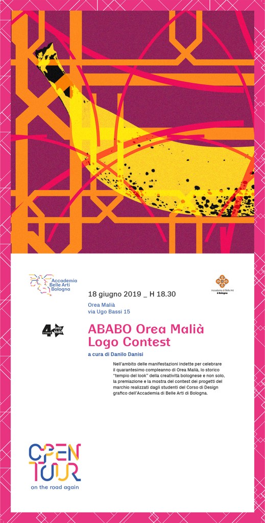 As part of the events organized to celebrate the fortieth birthday of Orea Malià, the historic “temple of look” of Bolognese creativity and beyond, the award ceremony and the exhibition of the contest of the brand’s projects created by the students of the Graphic Design Course of the Academy of Fine Arts of Bologna. The project is a part of “Ababo Opentour 2019” main event.